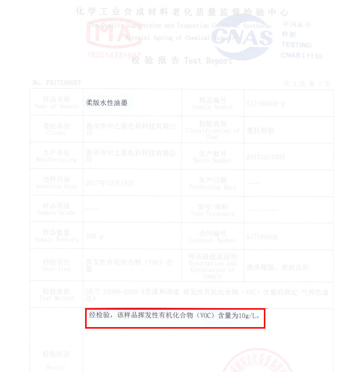 中之星色彩生產(chǎn)的柔版水性油墨檢測(cè)報(bào)告如下:VOCS的含量為10g/L,也就是含量為1%左右。而國(guó)家相關(guān)標(biāo)準(zhǔn)是5%。檢測(cè)報(bào)告如下圖: