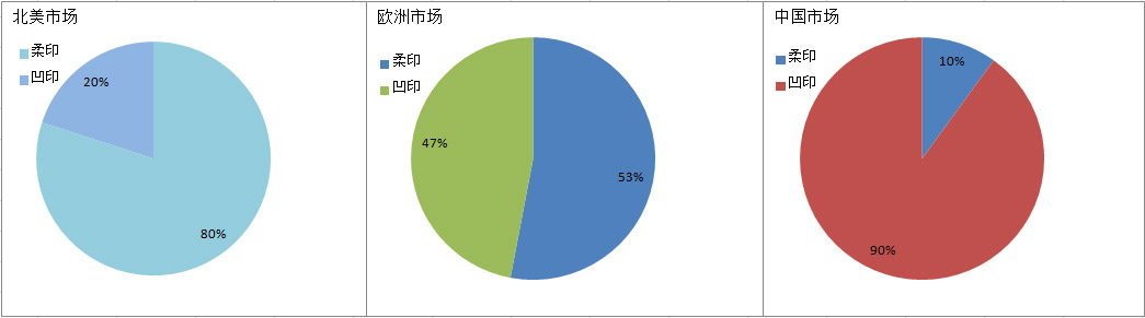 水性油墨從出現(xiàn)之初,就以其環(huán)保的特點(diǎn)在歐美等發(fā)達(dá)國(guó)家開始流行,到了現(xiàn)在水性油墨的技術(shù)不斷改進(jìn),柔版印刷技術(shù)與水性油墨的配合,打開了更廣闊的市場(chǎng),以北美市場(chǎng),柔版印刷的比例達(dá)到80%,在歐洲,柔版和凹版幾乎相差無幾,柔版有著略微的領(lǐng)先優(yōu)勢(shì),占到53%,來看看我們的亞洲,主要是以我國(guó)為中心的東亞地區(qū),雖然柔版這幾年有了長(zhǎng)足的發(fā)展,然而柔版依然只占印刷市場(chǎng)的10%左右,還有長(zhǎng)足的發(fā)展空間。